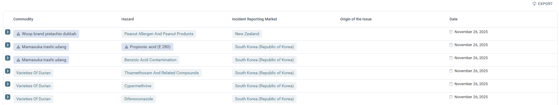 - It displays the specific commodity, hazard, reporting market, and origin.