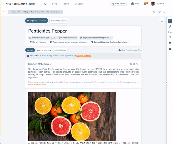 As part of regulatory change management process, sharing of the summary or extracted information is as easy as clicking on the copy text button:
