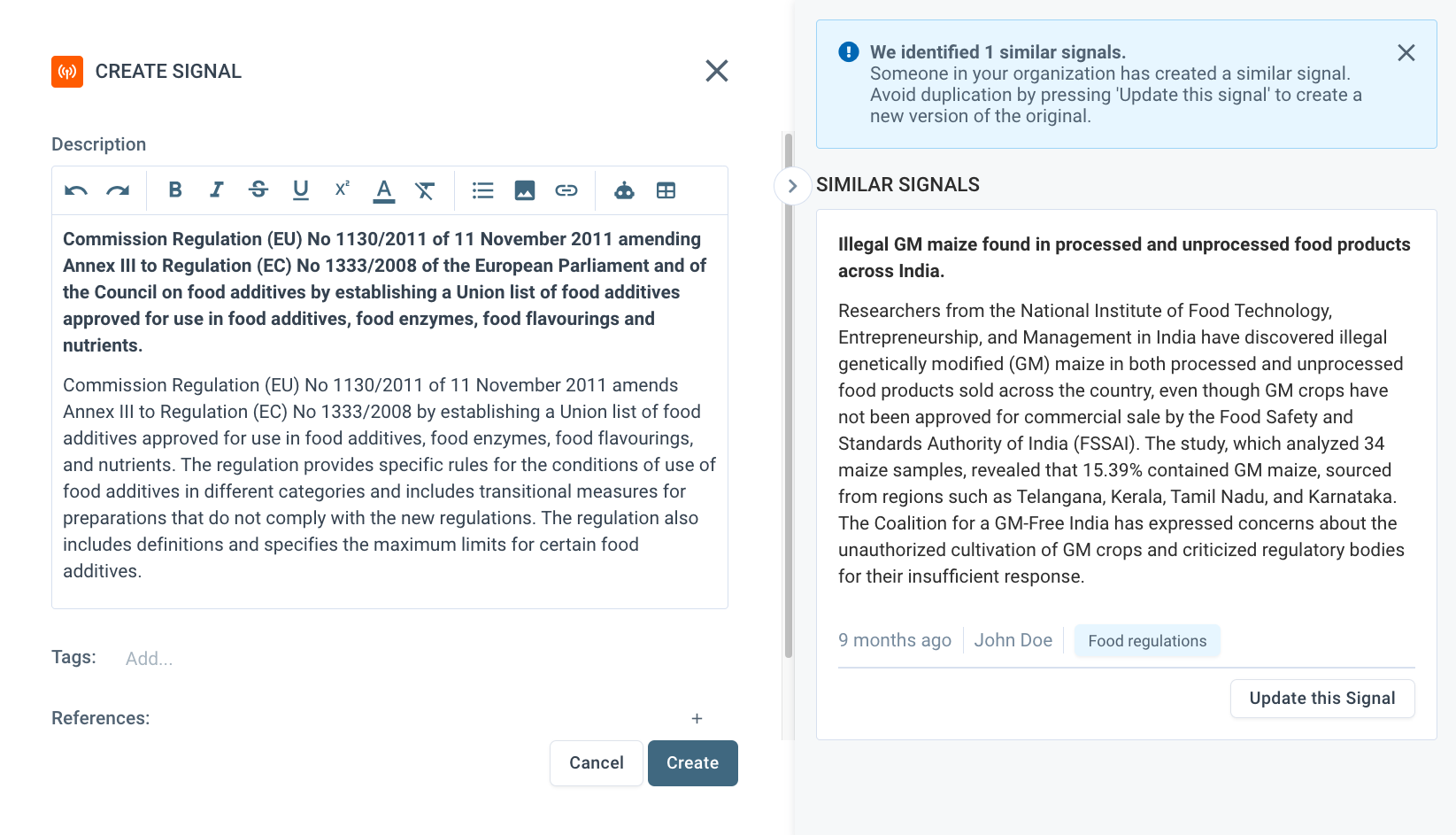 It may happen that the information in your new Signal is identical or very similar to a Signal already created by one of your colleagues. In such cases, you will be notified during the Signal creation process.