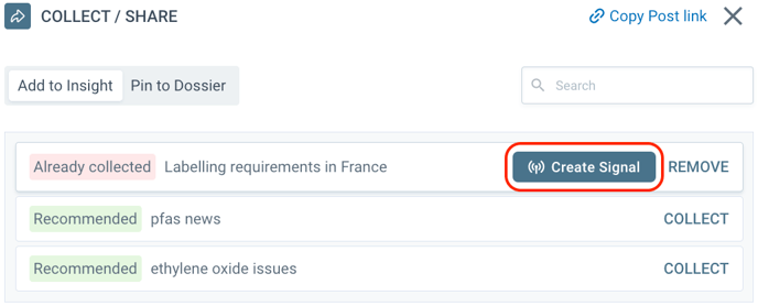 When you are in the dialog for collecting the content, you can see Create Signal button next to the Insight, where the document is collected.