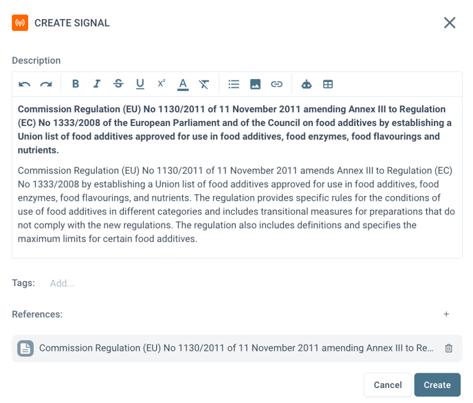If you would like to modify the description or include/exclude certain information, you are free to update it as needed. Once you are satisfied with the Signal, click Create to save it.