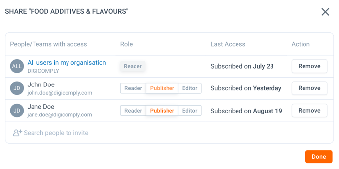 - Click the desired role button (Reader, Publisher, or Editor) next to their name.