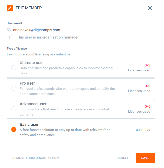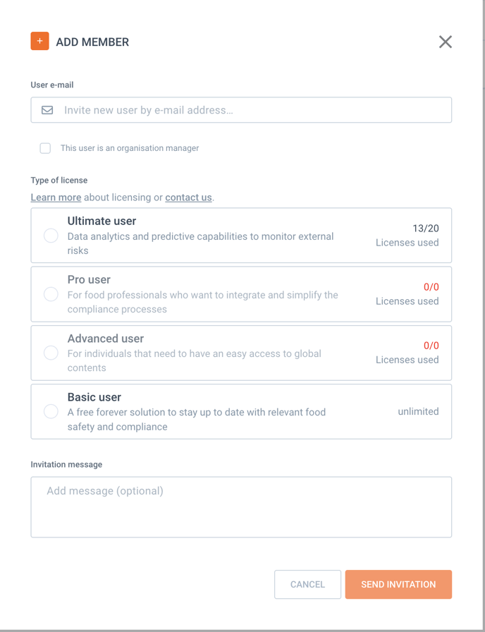 Once the 'My organisation members' dialog is open, you can assign a specific license from those purchased for your organization. If all available seats have been used, please follow the link in the dialog to contact us.
