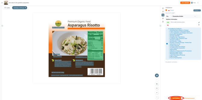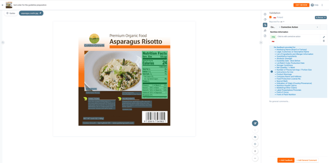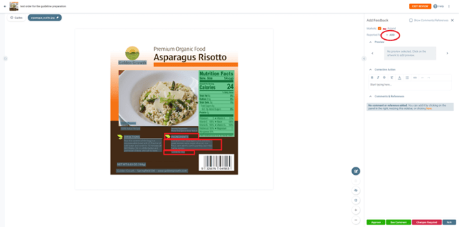 Press the section on the artwork you would like to validate. You can select multiple parts of the artwork, simply click on all areas you would like to include in the assessment. In this case, we have 3 artwork areas we would like to include in the assessment. Then press ADD to add the element you would like to validate. In this case we choose the element List of Ingredients and Allergen Information.
