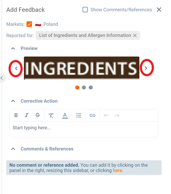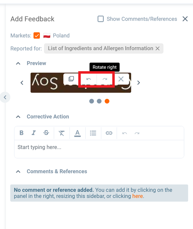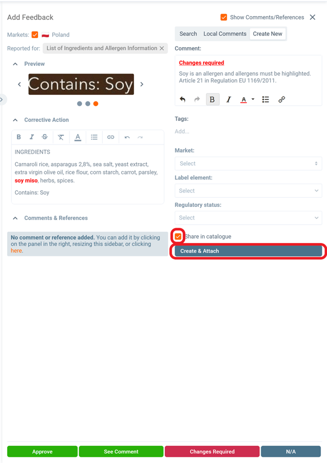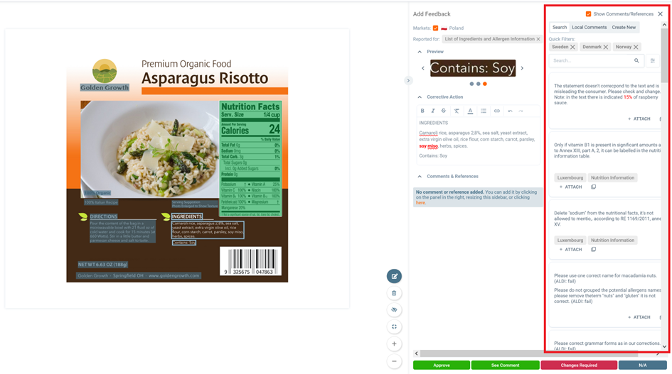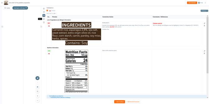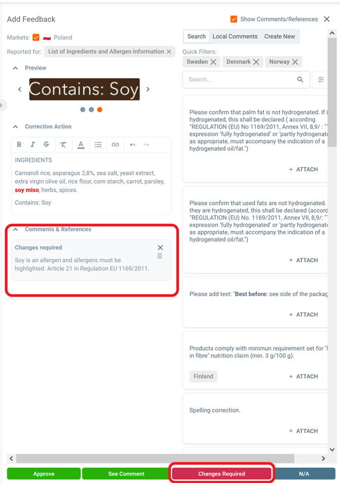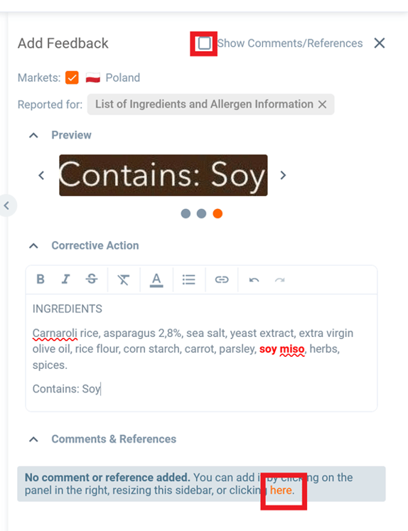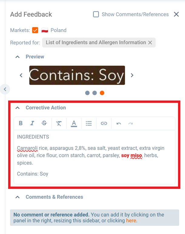 Now let’s continue with providing feedback. In this case we would like to inform that the allergen soy is not highlighted.