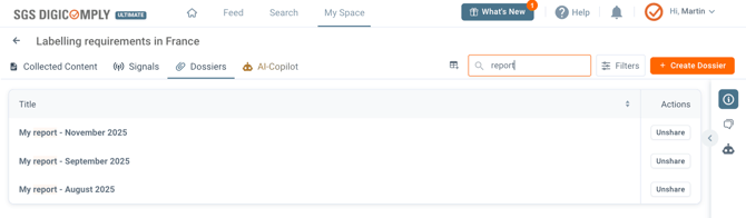 - Once you find your Dossier, click the Unshare button on the right. A confirmation dialog is opened