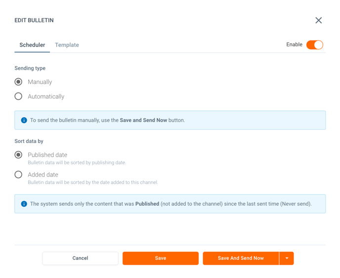In the Scheduler tab, you can choose to send the bulletin manually (only when needed) or automatically at a specified interval (daily, weekly, or monthly).