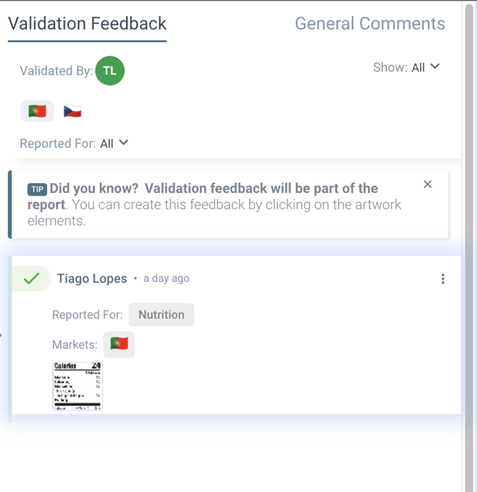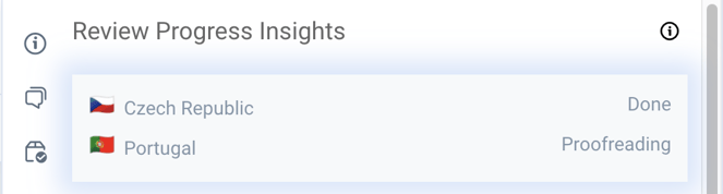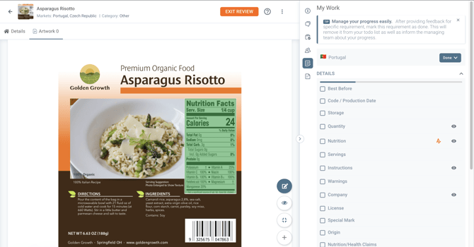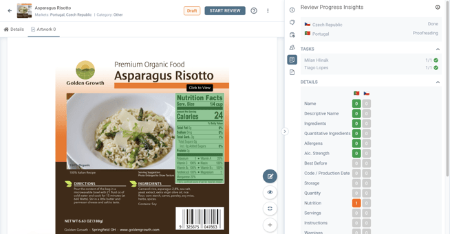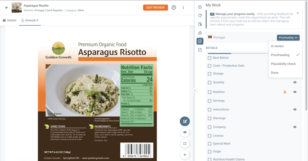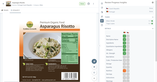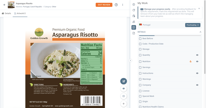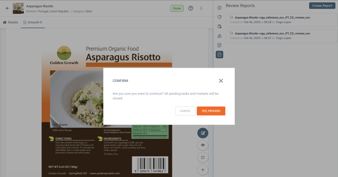The starting point for this one is right after the reviewer has already finalized the Review of the Label, has already set the Market status (in this example for the Portuguese Market) for Proofreading, and has also marked the task assigned as DONE.