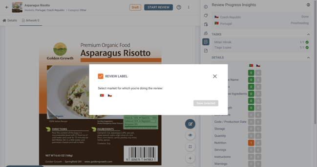 - We have a new button "Start Review", so now for anyone to actually start reviewing the Label, the first thing to do is to click the button "Start Review" by doing that the system will ask for which market do you want to do the review for, from that point you select the correct market for your review work and start reviewing.