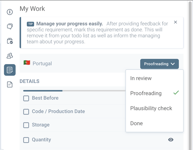 And we have the option to change the Market status for when we finalize the Proofreading and/or if your team only goes through Plausibility check then it's to change the status to done after finalizing the Plausibility check.