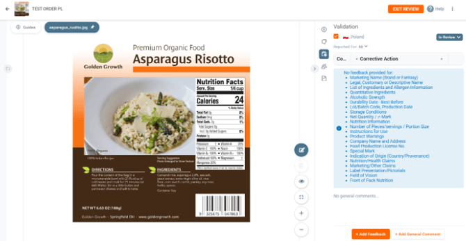 The first part contains the same properties as used in the original SGS FOOD LABEL REVIEW template. These properties are automatically filled based on the properties* defined in the Label Information section. Also, the label preview is added automatically.* The only difference is the Overall Conclusion, which is generated based on the validation feedback(s)