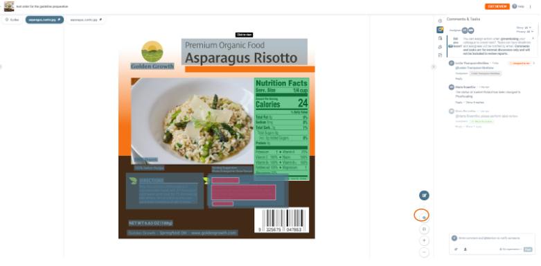 After the uploaded artwork is processed by the system, the artwork will be “enriched” by detected elements (selectable areas) that are classified (e.g. product name, list of ingredients, …).