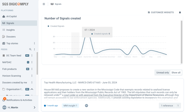 This is the landing page of the Insight module view. Here you can find all the created Signals, with the most recent ones at the top. You can choose to view only unread items or both unread and read items together.