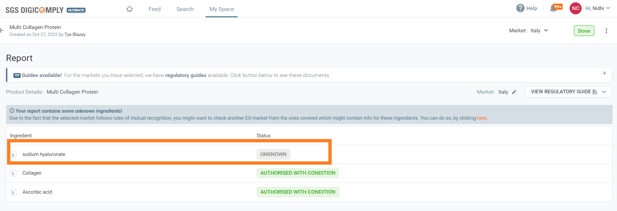 If no regulatory document is available for the ingredient (e.g. positive or negative list from the Authorities) the status for that particular ingredient is UNKNOWN or INCONCLUSIVE, as we lack the information for asserting the regulatory status. The status of APPROVED or COMPLIANT is only granted when an existing regulation confirms it.
