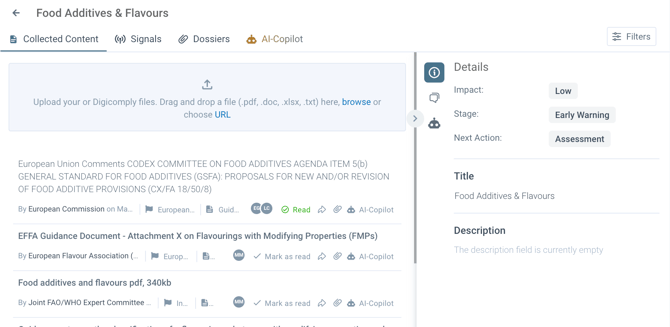 - Posts: You can add content from Digicomply search results, upload your own local files (PDFs, Excel), or add specific external URLs.